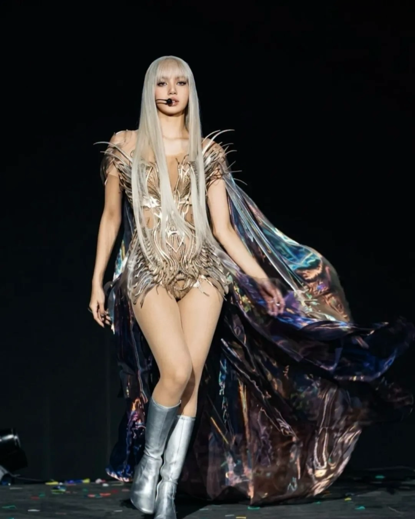 강풍으로 인한 공연 취소의 아쉬움을 단번에 씻어낼 만큼 리사의 무대는 압도적이었습니다. 애니마(Animan)와의 협업으로 완성된 비주얼 연출은 불어오는 바람조차 하나의 소품처럼 느껴지게 했죠. 이날 리사는 ‘Bad Angel’을 열창하며 말 그대로 사막에 불시착한 천사의 모습을 구현했습니다. 그녀가 선택한 이리스 반 헤르펜(Iris van Herpen) 커스텀 드레스는 유기적으로 뻗어 나온 조형적 구조가 특징으로, 투명한 베이스 위에 메탈릭한 장식을 덧입혀 생물학적인 긴장감과 전위적인 무드를 동시에 자아냈죠. 움직임에 따라 오로라빛 광택을 흩뿌리는 롱 트레인과 리사의 은빛 백발은 마치 인류 이후의 새로운 생명체를 마주하는 듯한 환상적인 잔상을 남겼습니다. 여기에 루이 비통의 커스텀 부츠가 더해져 미래지향적인 퓨처 페어리 코어의 정점을 찍었습니다.