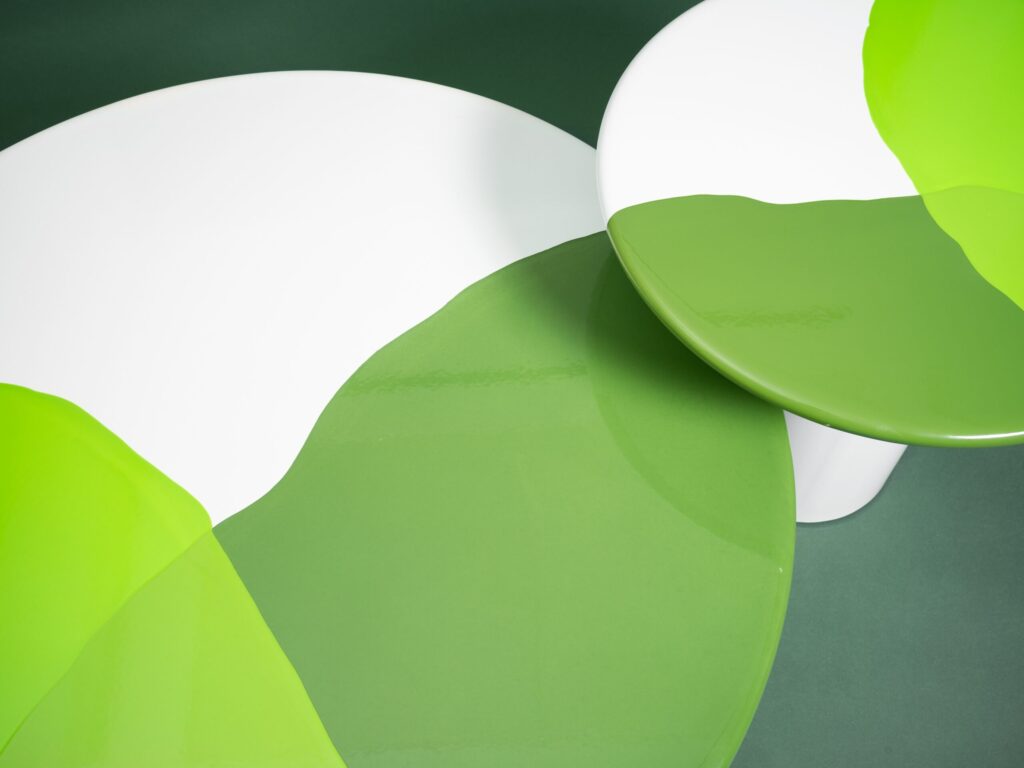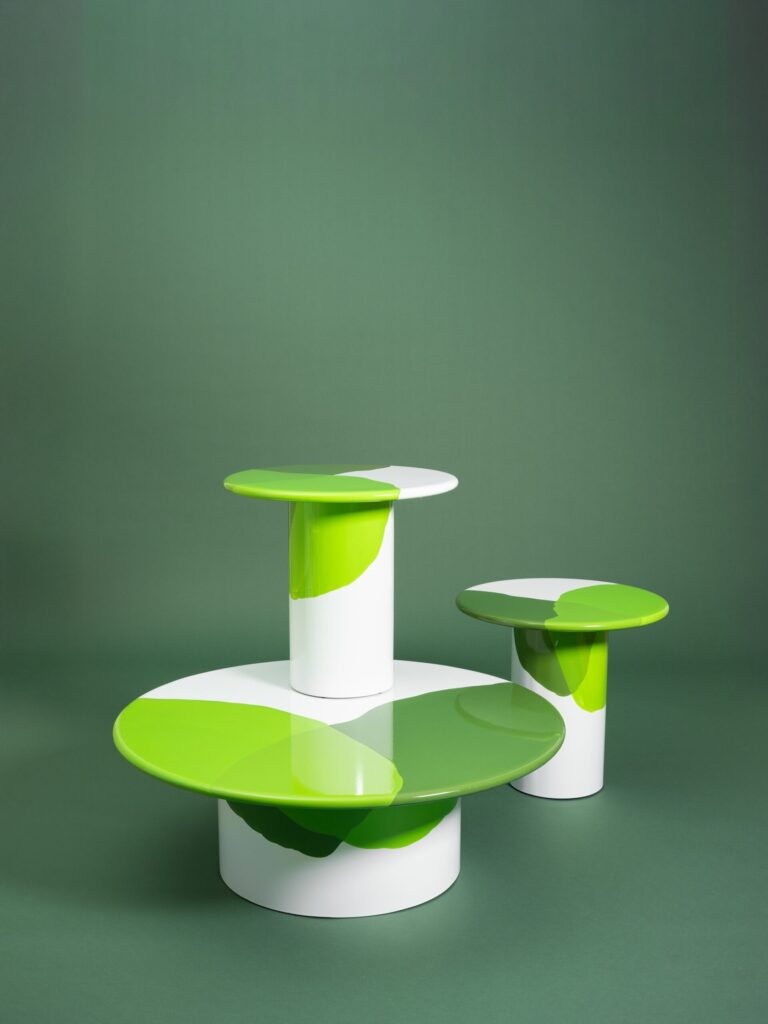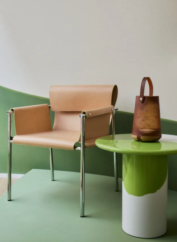 이번 팝업의 주인공인 가구들은 패트릭 주앙의 에디션 제품을 기반으로 하되, 롱샴 특유의 컬러 팔레트와 가죽 디테일을 입혀 완전히 새로운 생명력을 얻었습니다. 먼저 시선을 끄는 것은 ‘DROP’ 사이드 테이블과 커피 테이블입니다. 롱샴의 시그니처 컬러인 라이트 그린과 헤리티지 그린이 스핀 스틸 소재의 에나멜 표면 위로 매끄럽게 흐르며 모던한 존재감을 과시합니다.
