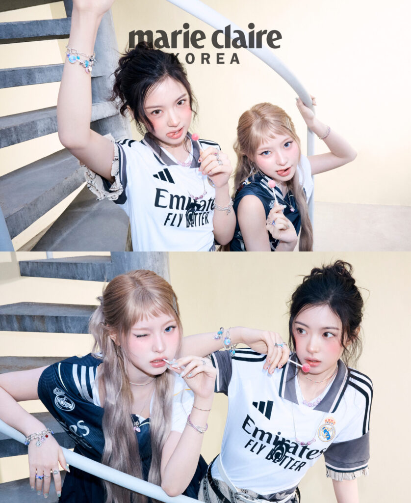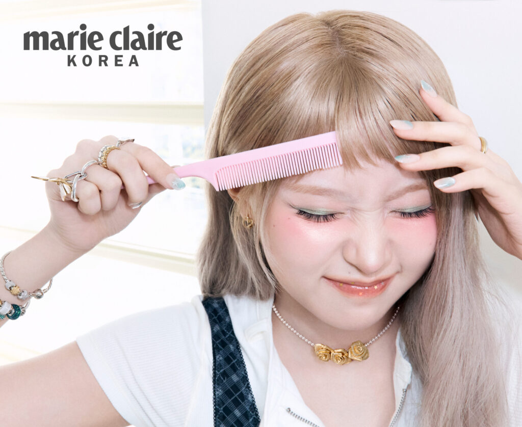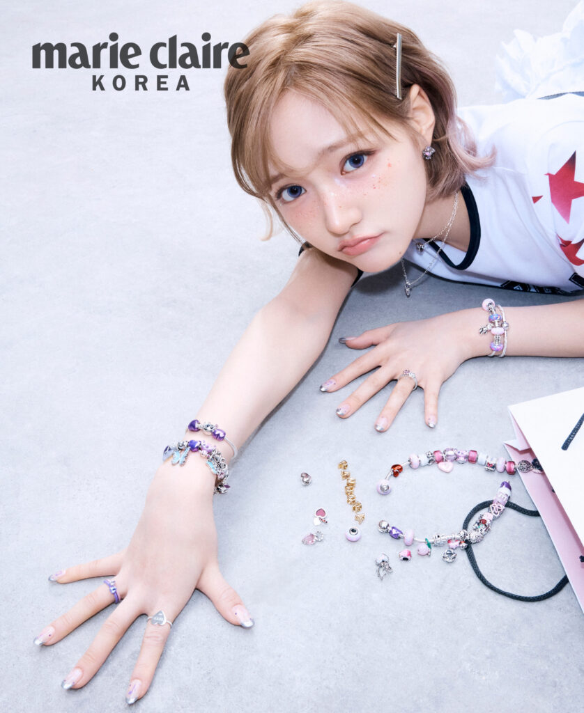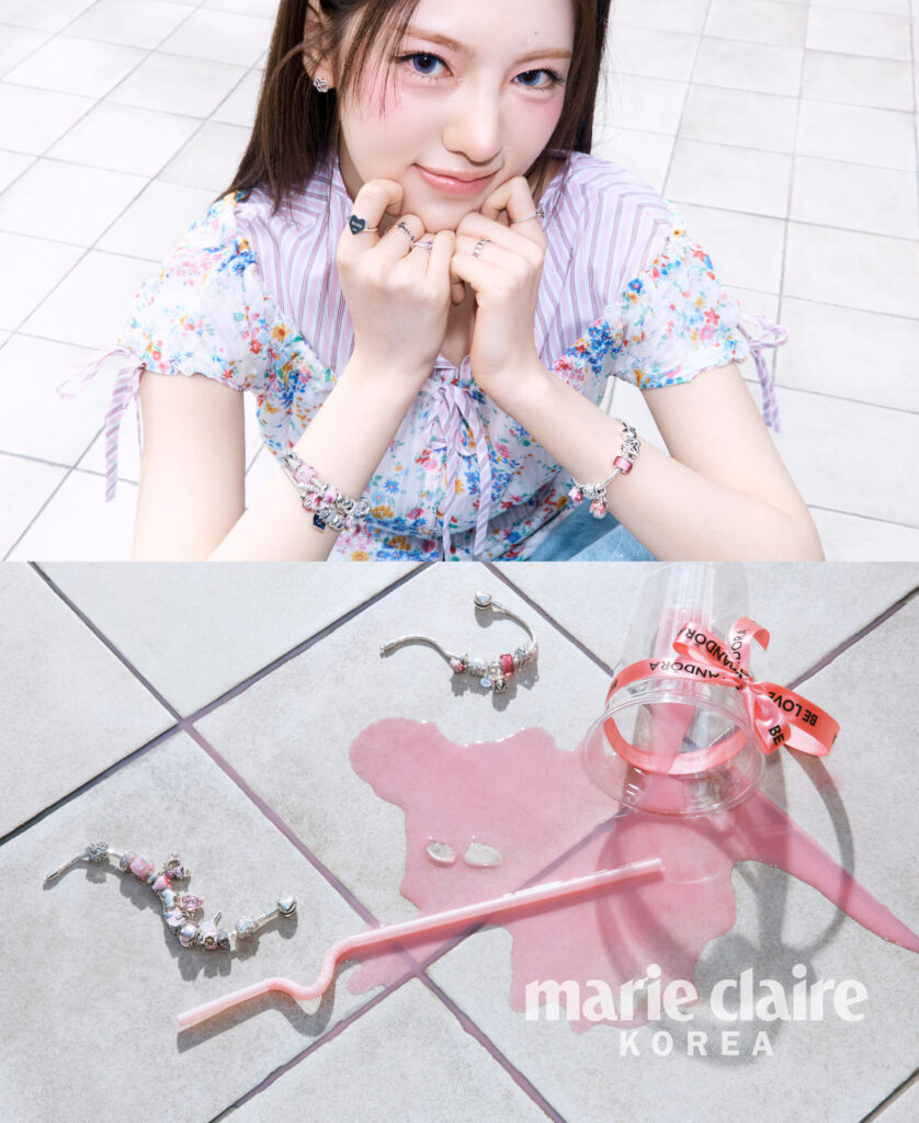 (위) 로맨틱한 무드의 버터플라이 스터드 이어링, 오른손 검지의 인그레이버블 하트 링, 핑크 무라노 글라스 러브 큐브 참을 포함한 핑크빛 모멘츠 참으로 연출한 브레이슬릿 등 수이가 착용한 주얼리 모두 PANDORA.