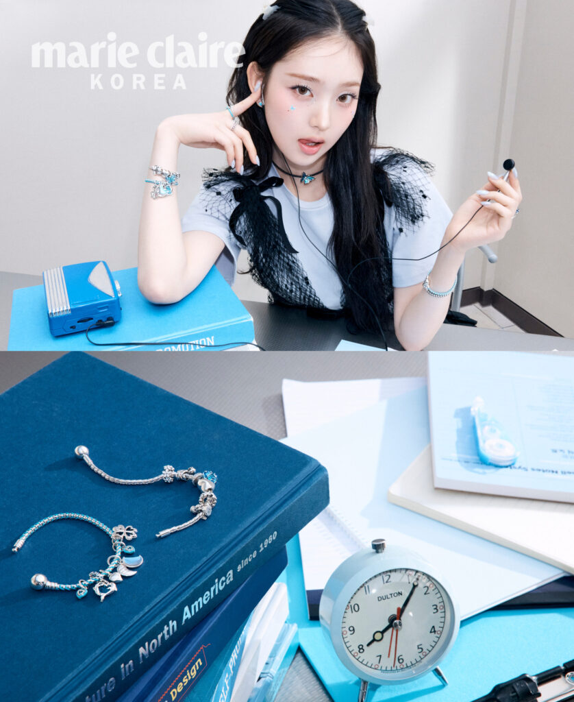 (위) 터쿼이즈 블루 이터니티 서클 스터드 이어링, 오른손 검지의 인그레이버블 하트 링, 오버사이즈드 버터플라이 참을 더한 네크리스, 시원한 블루 컬러 코드 박스 체인에 판도라 모멘츠 참, 판도라 미 터쿼이즈 차크라 하트 링과 댕글 참으로 스타일링한 브레이슬릿 등 이솔이 착용한 주얼리 모두 PANDORA.