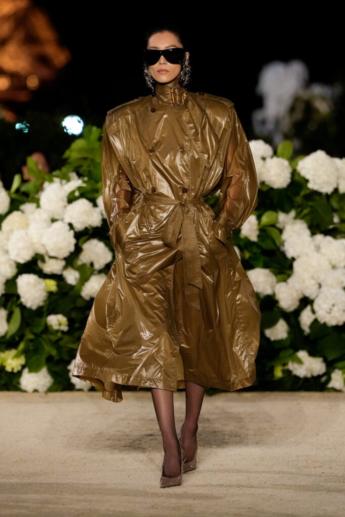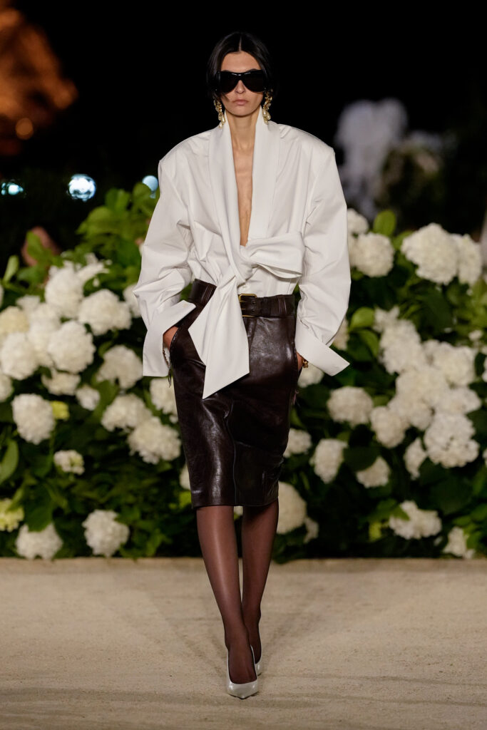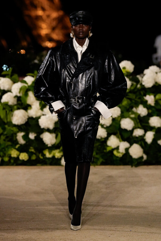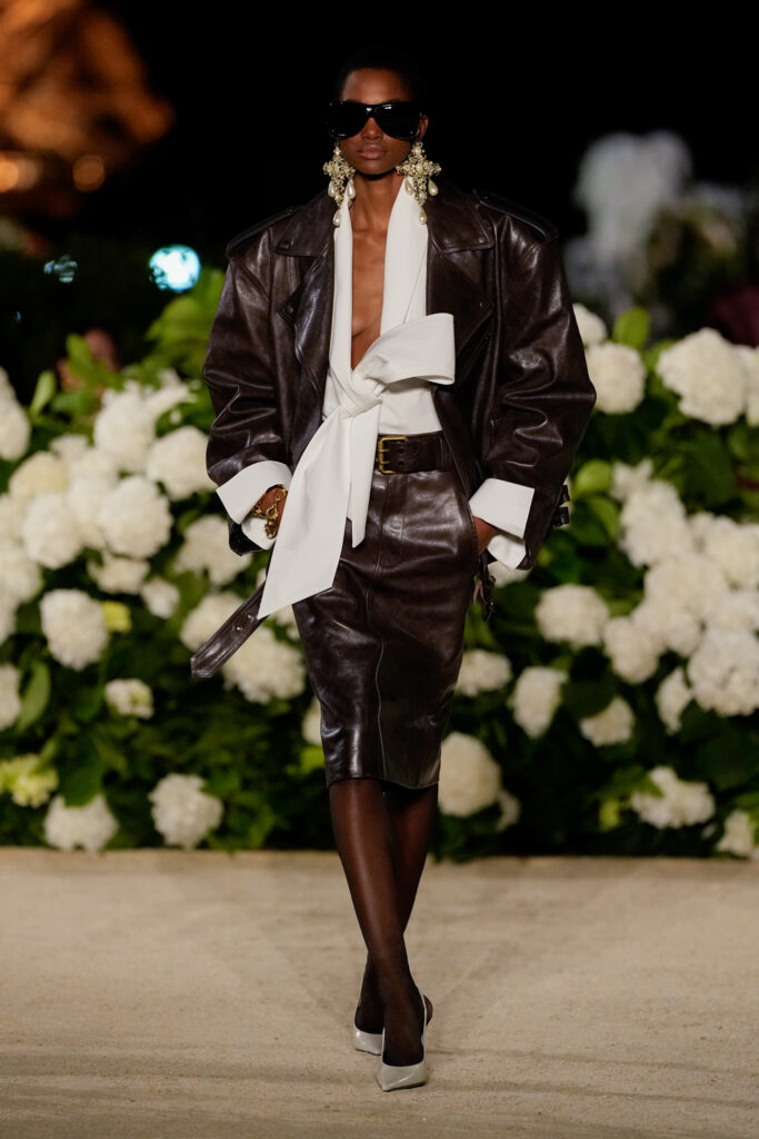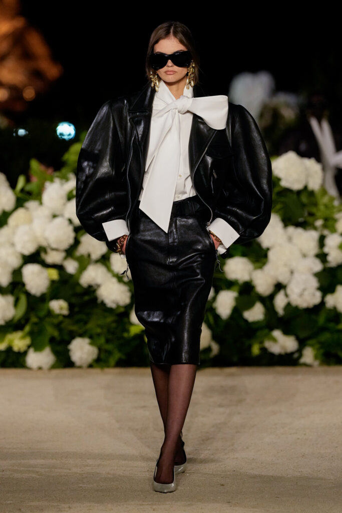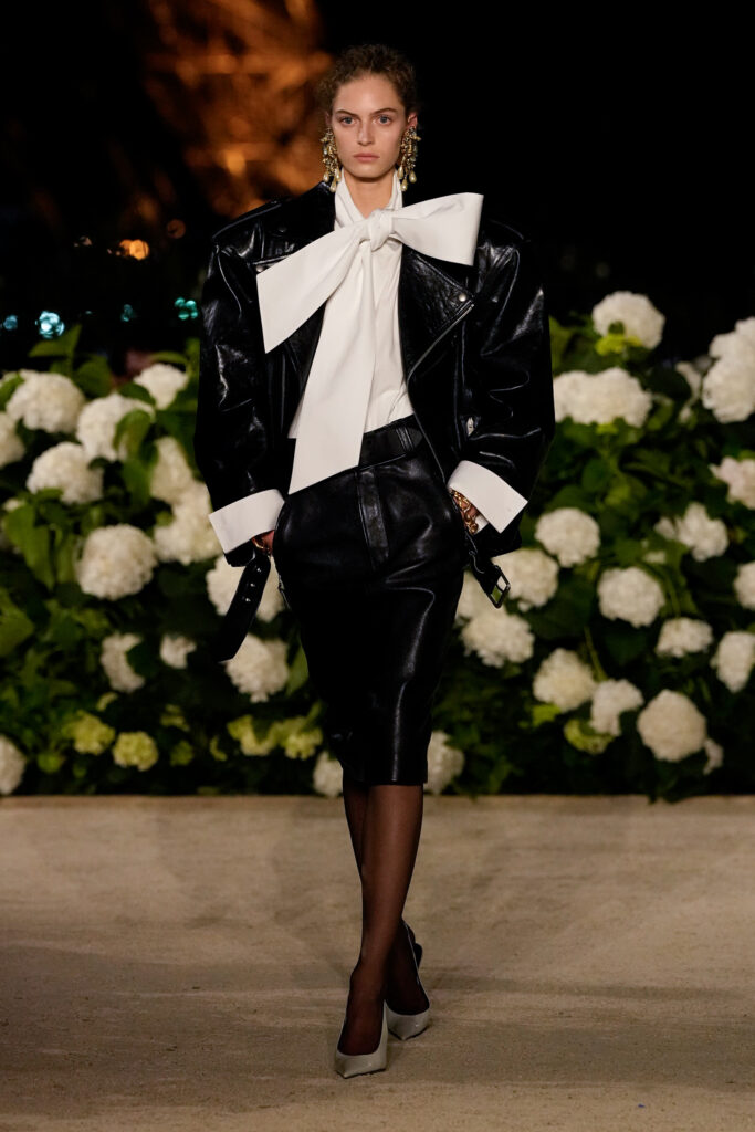 NOTE 파리의 낭만이 내려앉은 밤의 트로카데로 정원. 안토니 바카렐로는 생 로랑의 미학을 통해 다수의 형태로 존재하는 여성의 아름다움을 3개 챕터로 명료하게 구분했다. 먼저 커다란 보 디테일 블라우스와 레더 재킷, 펜슬 스커트를 입은 여인의 매력적인 행진 뒤로, 이브 생 로랑이 사랑했던 찬란한 컬러를 입은 실용적인 룩의 향연이 펼쳐졌고, 뒤를 이어 애드벌룬처럼 부풀어 오른 나일론 드레스가 대미를 장식한다. 영화적 분위기 속에서 생 로랑의 여성은 고전적인 동시에 다면적인 모습으로 존재감을 드러냈다.