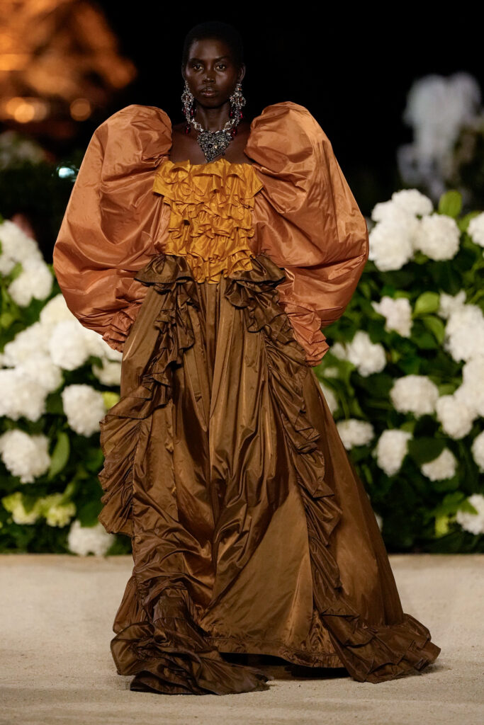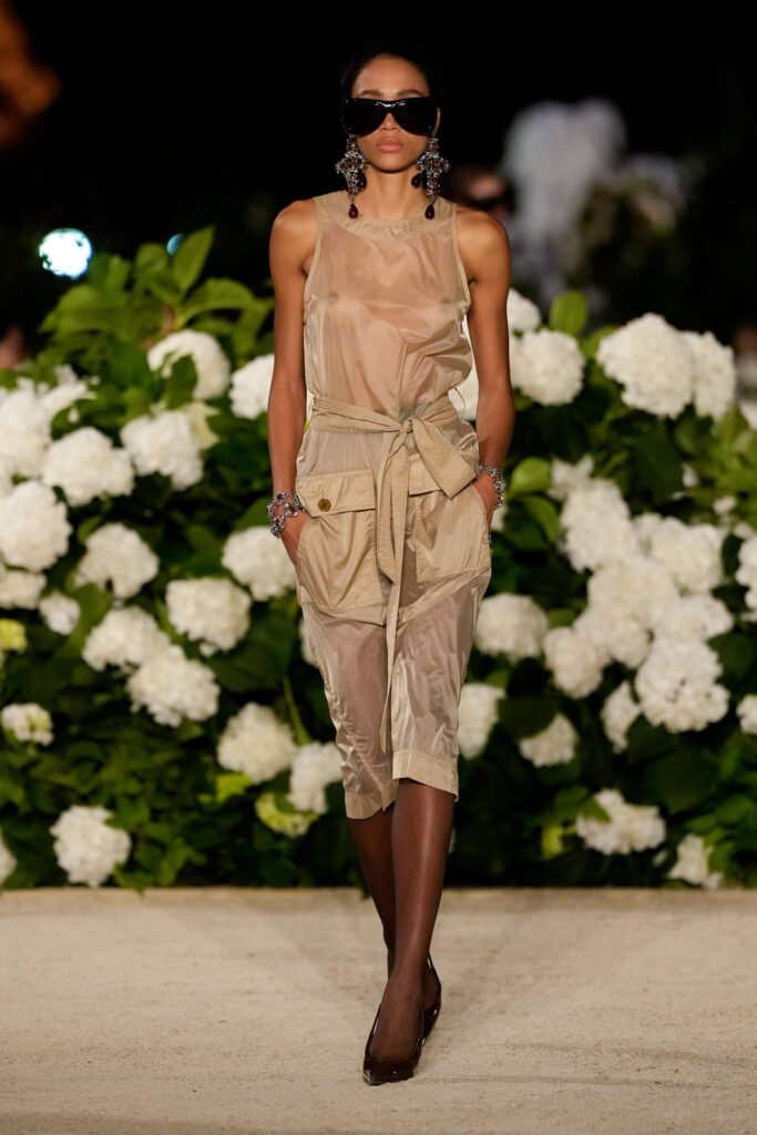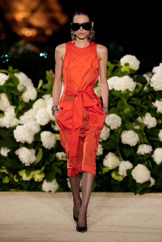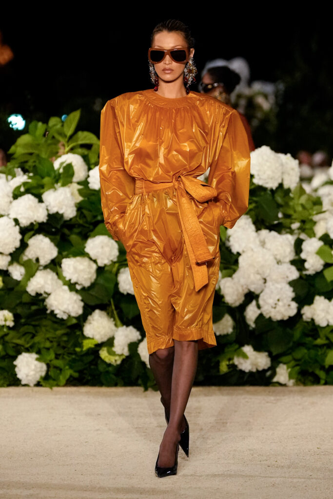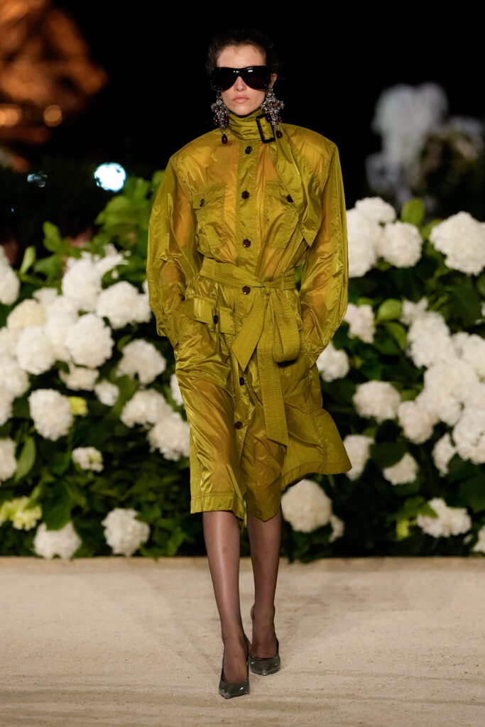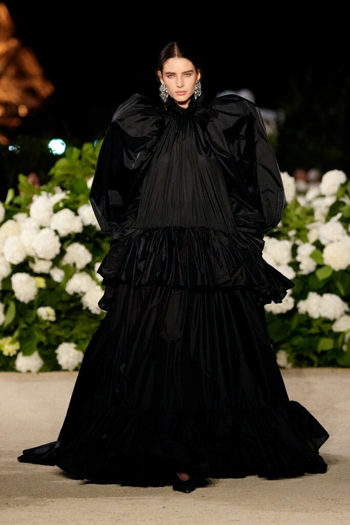 NOTE 파리의 낭만이 내려앉은 밤의 트로카데로 정원. 안토니 바카렐로는 생 로랑의 미학을 통해 다수의 형태로 존재하는 여성의 아름다움을 3개 챕터로 명료하게 구분했다. 먼저 커다란 보 디테일 블라우스와 레더 재킷, 펜슬 스커트를 입은 여인의 매력적인 행진 뒤로, 이브 생 로랑이 사랑했던 찬란한 컬러를 입은 실용적인 룩의 향연이 펼쳐졌고, 뒤를 이어 애드벌룬처럼 부풀어 오른 나일론 드레스가 대미를 장식한다. 영화적 분위기 속에서 생 로랑의 여성은 고전적인 동시에 다면적인 모습으로 존재감을 드러냈다.
